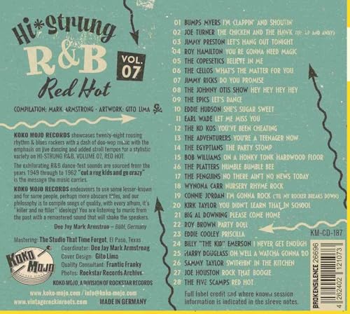 Koko Mojo Records showcases twenty-eight rousing rhythm & blues rockers with a dash of doo-wop music with the emphasis of jive dancing and added stroll tempos for a stylistic variety on HI-STRUNG R&B, VOLUME 07, RED HOT.