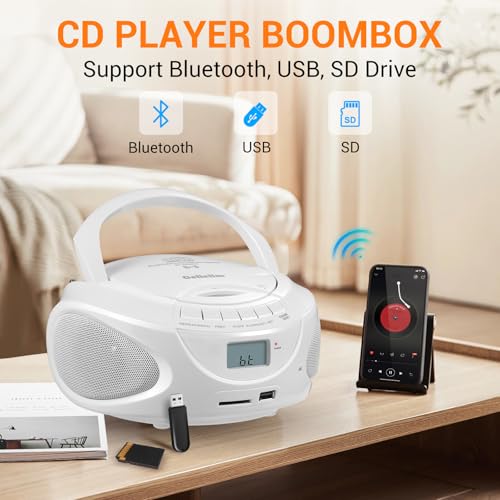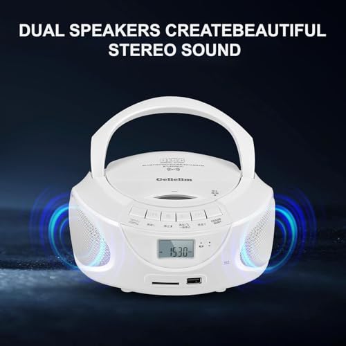 Gelielim Portable CD Player Boombox with AM/FM Stereo Radio, Bluetooth,Support USB,SD, Aux-in,MMC Drive, LCD Display,Headphone Jack, AC/Battery,for Kids,Seniors,Home-White