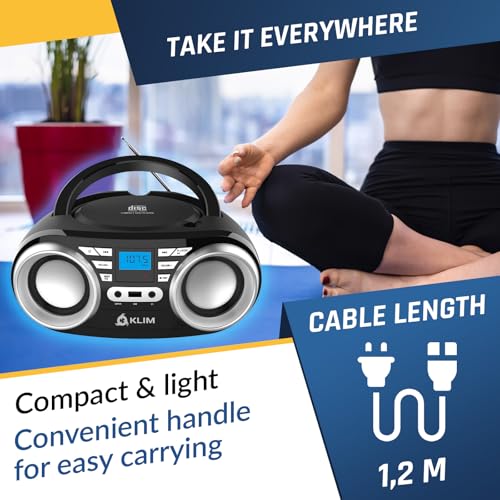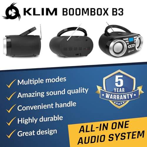 KLIM B3 Portable CD Player Boombox with FM Radio, Bluetooth, USB, AUX, and FM Radio Dual Speakers, EQ Sound Effects, 20 Preset Stations, Compact and Lightweight