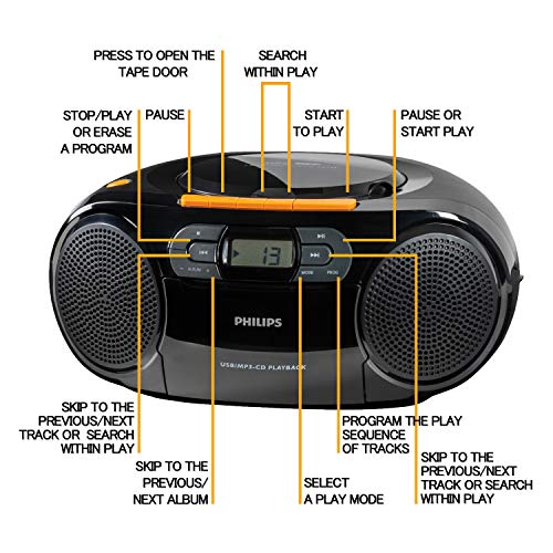 Philips Portable CD Player Boombox – Portable MP3 Player and Cassette Tape Player, Boom Box Compact Stereo Sound System with Dynamic Bass Boost, Take Your Music Outside with USB HiFi Music Player