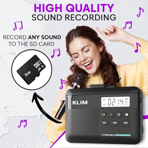 KLIM K7 Cassette Tape Player + Cassette to MP3 Converter + Portable Cassette Player + Built-in Microphone & Speaker + Rechargeable Battery + Earphones + 8GB SD Card