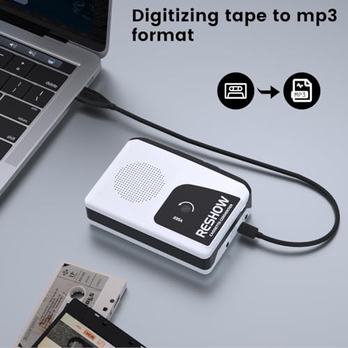 Reshow Portable Cassette Recorder Player with Built-in Speaker and Headphone Jack, USB C Cassette to MP3 Converter, Reverse Recording to Tape, Microcassette Recorder Player, Full Stereo Sound-White