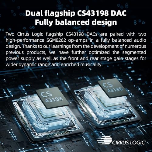 Dual flagship DACs, CS43198, with a powerful 700mW output drive: The JM21 features a fully balanced audio architecture, powered by two flagship Cirrus Logic CS43198 DACs paired with two high-performance SGM8262 operational amplifiers. Through audiophile-grade circuit design and tuning, the JM21 delivers a balanced output power of up to 700mW + 700mW, offering powerful drive and exceptional sound quality. It effortlessly powers headphones or large over-ear models with ease and authority.