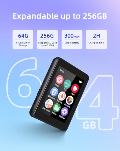 64GB MP3 Player with Bluetooth 5.3, 2.4″ Portable Music Player with Speaker, FM Radio, Voice Recorder, E-Book, Full Touch Screen, Supports up to 256GB (Earphones Included)