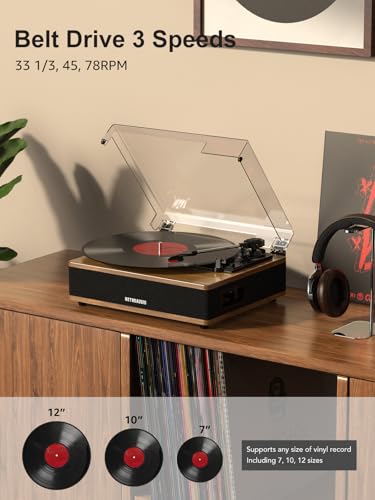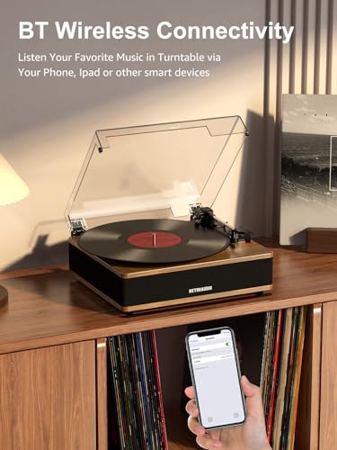 【Retro-Modern Design】Crafted with a premium wood, this turntable blends vintage charm with contemporary style. The dust cover protects your player while doubling as a sleek home decor piece. Turntable with suitable size can be placed in any corner of the home, such as the living room, bedroom, office.