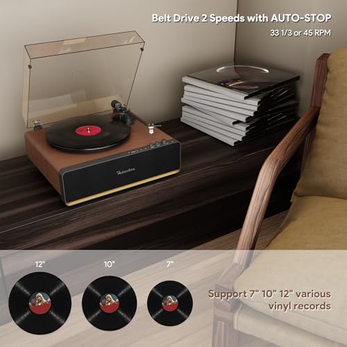 【All-in-One Turntable System】This VATAVION vinyl record player spins at 33 and 45 RPM, playing all your 7″, 10″, and 12″ vinyl records with ease. Enjoy wireless Bluetooth connectivity to stream music from your smartphone, tablet, or other devices. For enhanced sound, connect external speakers via the included RCA cable. With both Phono and Line outputs, this turntable with built-in speakers works seamlessly with or without a Phono equalizer, delivering high-fidelity audio for every vinyl lover.