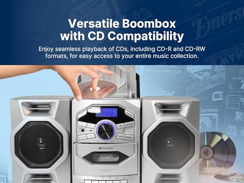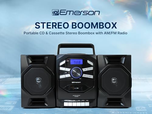 Emerson Portable CD Player Boombox with Cassette Player, Tape Recorder, AM/FM Radio, MP3 AUX Input, Detachable Speakers, AC/DC & Battery Operated – Stereo System for Home, Travel, Indoor & Outdoor Use