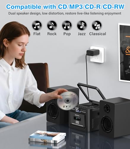 【9-in-1 Home Stereo System】Supports CD/ Tape/ Recording/ AUX/ FM Radio/ Bluetooth/ USB/ TF/ Remote Control playback. Compatible with CD, CD-R, CD-RW, MP3 and WMA. It has normal, single cycle, full cycle, random play, and A-B repeat functions