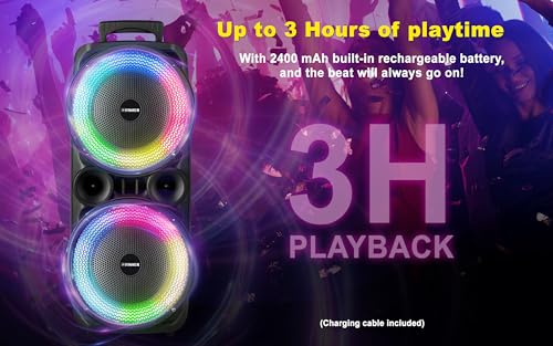 POWERFUL PRO SOUND PARTY SPEAKER: Immerse yourself in the dynamic power output of our portable bluetooth party speaker. Designed to deliver deep bass, crisp mids, and crystal-clear highs, it creates an audio experience that captivates and energizes, making every moment unforgettable. Comes with microphone and remote control