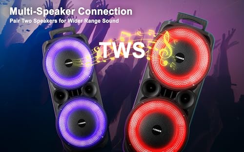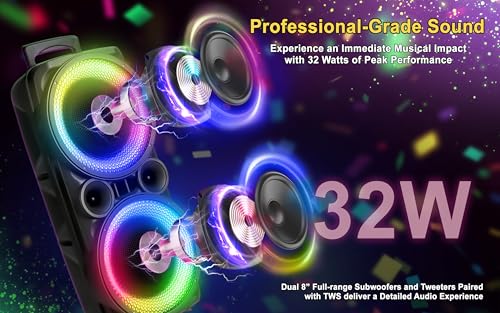 Fisher Bluetooth PA Stereo Speakers System-Karaoke Portable Wireless DJ, Dual 8″ 32W Peak Power, Loud HD Sound & LED Lights, Rechargeable, Subwoofer, USB, TWS, FM Radio, Indoor/Outdoor Party