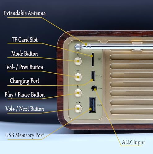 FM Radio with Bluetooth Retro Bluetooth Speaker Vintage Radio with SD/USB Memory Music Player Function, Wireless Streaming from Smartphone, Up to 10 Hours Playback (Walnut)